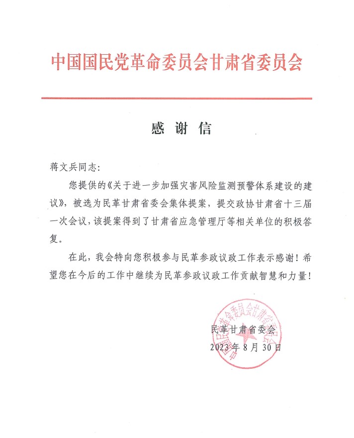 伟德民革党员、城市经济学院副教授蒋文兵撰写的《关于进一步加强灾害风险监测预警体系建设的建议》,被选为民革甘肃省委会集体提案,提交政协甘肃省十三届一次全会,提案得到了甘肃省应急管理厅等相关单位的积极答复。