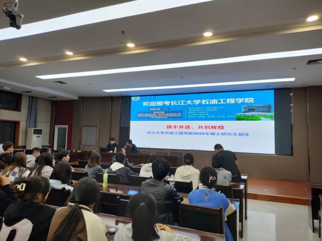 长江大学石油工程学院招生宣讲负责人从学院师资队伍、科研项目、研究方向、实验室条件、奖学金制度、研究生管理、就业渠道等方面做了系统、全面、细致的汇报,汇报后就报考研究生考试的有关事宜与相关同学进行了答疑。
