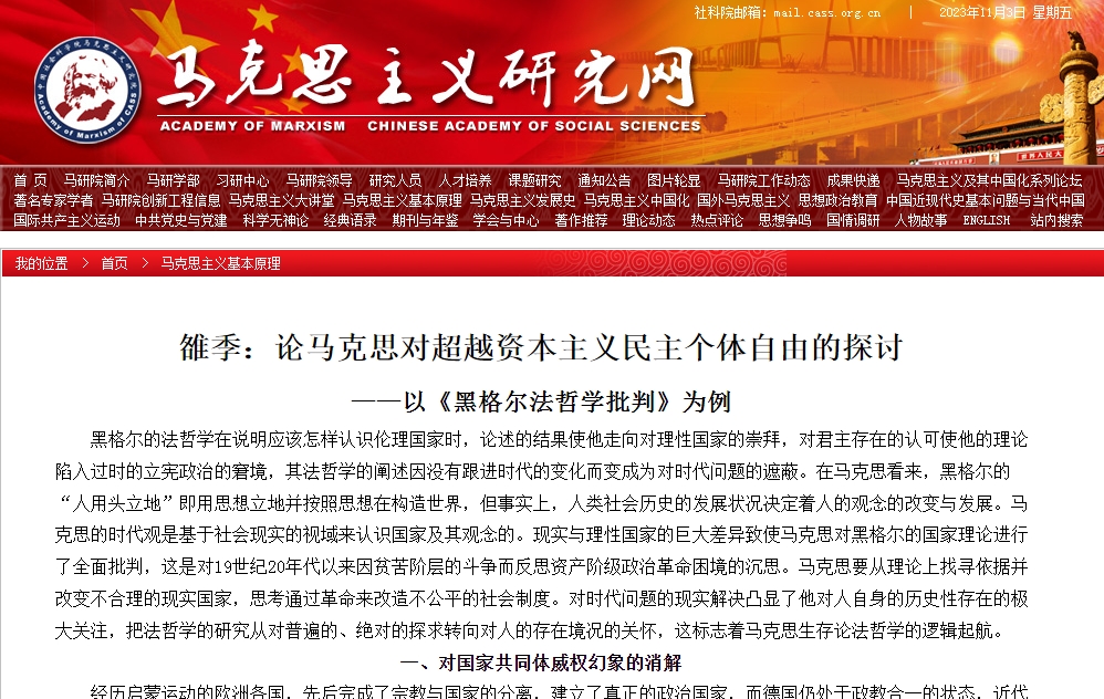 近日,伟德马克思主义基本原理教研室副教授雒季的学术论文《论马克思对超越资本主义民主个体自由的探讨——以<黑格尔法哲学批判>为例》被马克思主义研究网全文转载。