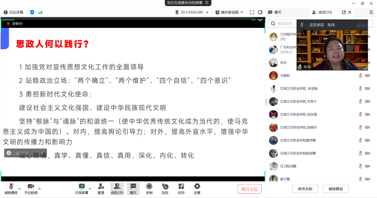 广东科技学院马克思主义学院负责人致辞,她充分肯定了虚拟教研室创建以来的工作成效,指出共建共享的广度和深度仍有较大空间,希望未来三地四校以动态、开放的姿态,吸纳更多的院校尤其是中西部高校加入,以突破省级虚拟教研室为目标,携手并进,共创辉煌。甘肃卫生职业学院马克思主义学院负责人赵晓玲围绕学校教学科研及红色文化思政教育实践教学作了分享交流。