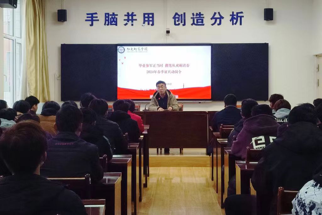为落实省教育厅和学校2024年大学生征兵工作会议要求,2月26日下午,幼儿师范学院在城关校区召开2024年大学生征兵动员会。学院党委负责人、征兵专干及全体男生70余人参加会议。