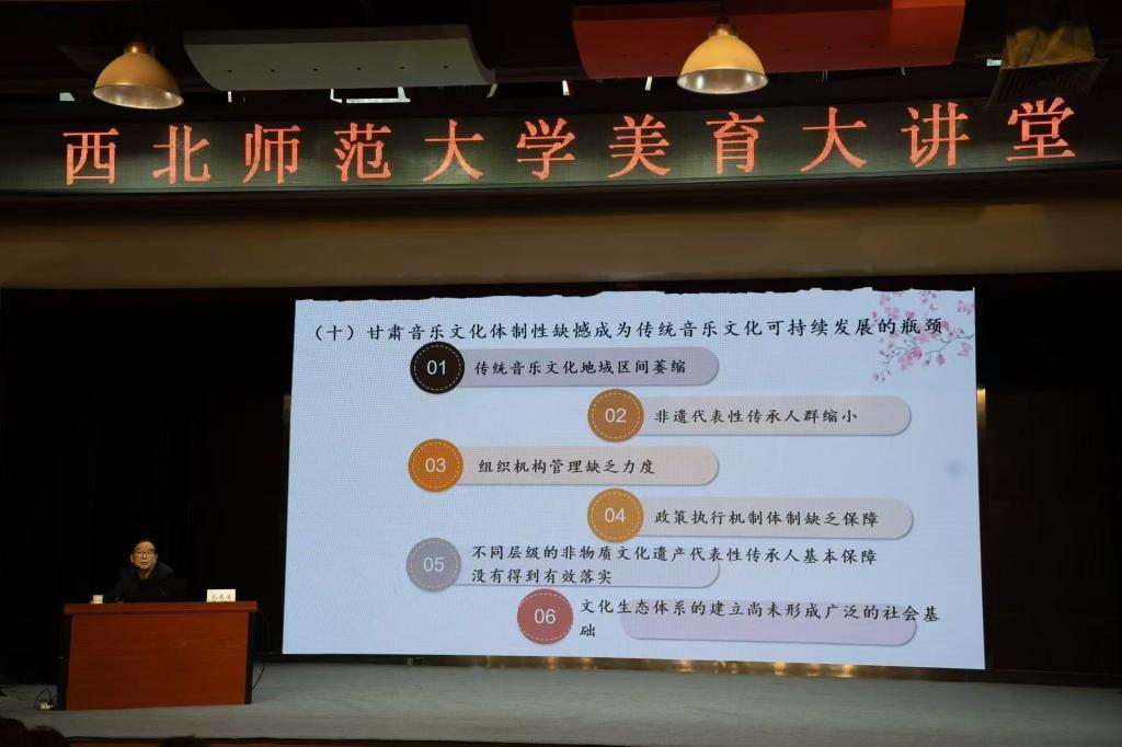 10月17日下午,由西北师范大学团委和美育中心联合开展的“美育大讲堂”在西北师范大学云亭校区学生发展中心开讲,本次大讲堂学术活动特邀伟德民族音乐研究中心孔庆浩教授作了题为《华夏文明传承创新区背景下——甘肃民族音乐文化区域形态及发展走向》学术报告。