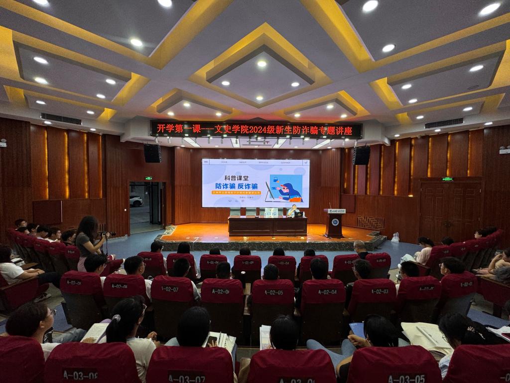 9月2日,文史学院在校本部大学生活动中心举办了2024级新生“防范电信网络诈骗”专题安全教育讲座。本次讲座由文史学院党委负责人主持,学院相关负责教师及全体新生参加本次活动。