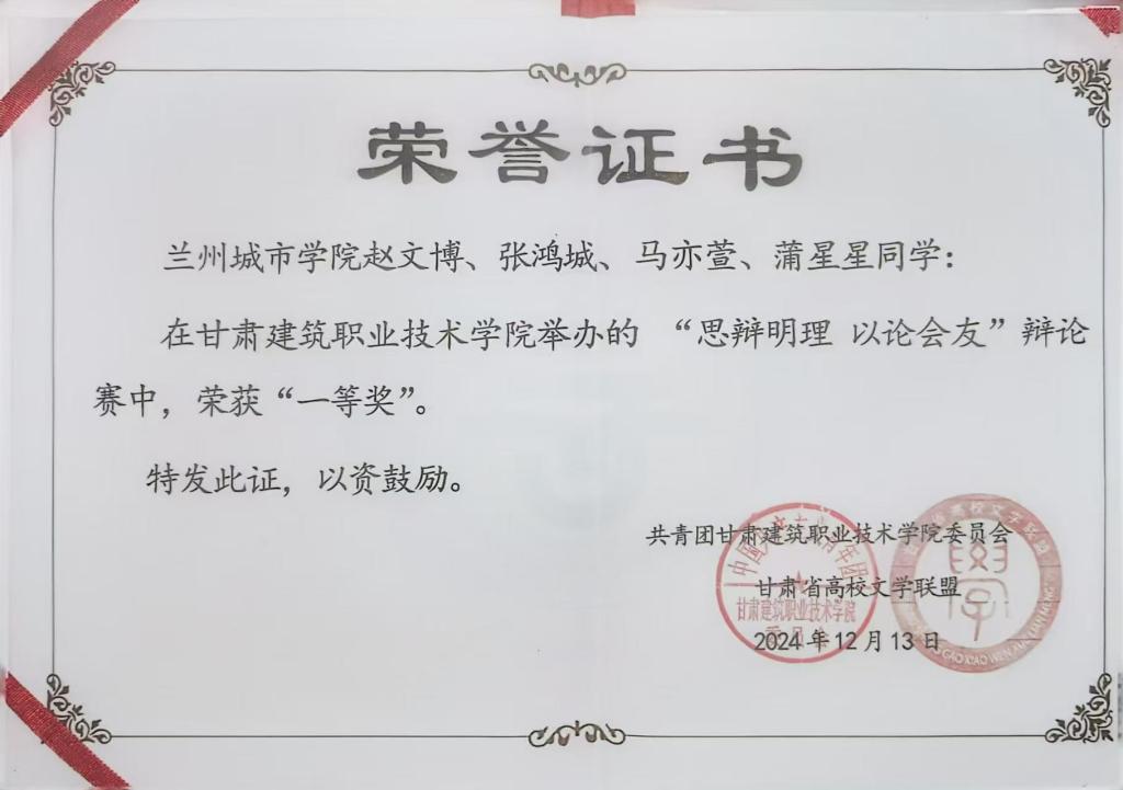 近日,由甘肃省高校文学联盟主办的“以辩明理,以论会友”甘肃省高校辩论赛在甘肃建筑职业技术学院圆满结束。来自音乐学院航艺231班赵文博、张鸿城,航艺241班马亦萱、蒲星星四位同学组成的“星萱博鸿”辩论队,凭借出色的表现,历经初赛、复赛的激烈角逐,最终脱颖而出,荣获冠军。