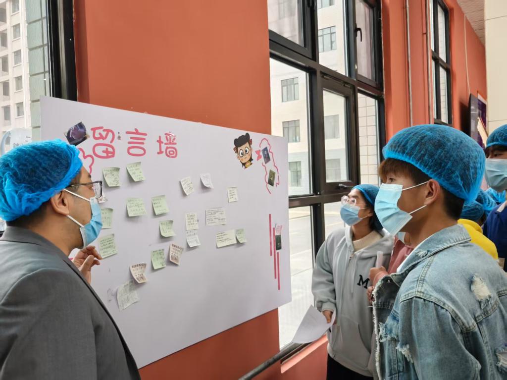 座谈会之后,饮食服务中心负责人站在食堂专门设立的“留言墙”前向同学们说道:“广大师生的意见与建议,就是我们更好开展工作的动力。近期,学校加大了对食堂的管理和整顿力度,在培黎校区食堂增设‘三控一室’和大型消毒设备,并对全校食堂菜品价格进行了全面审核。在本次省、市级市场监督管理局的检查中,培黎校区食堂以90.5分的成绩排名靠前。饮食服务中心将始终以高度的责任感和使命感做好饮食服务保障工作,及时梳理工作中的突出问题,不断改善广大师生就餐环境,丰富饭菜种类、调整饭菜价格、提升饭菜质量。”