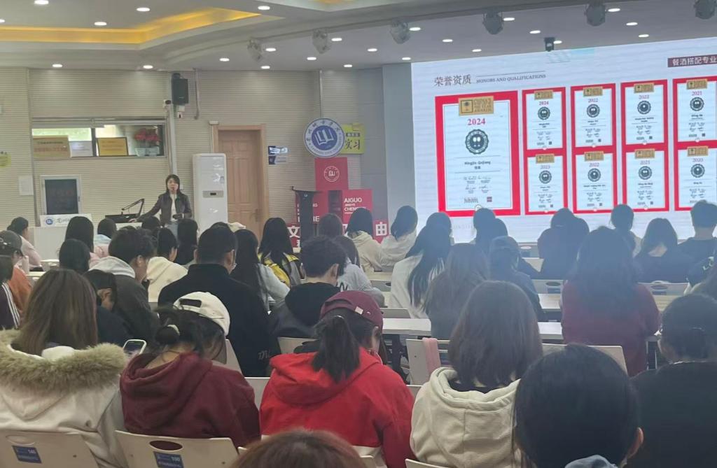 宣讲会上,企业负责人通过宣传片和PPT系统介绍了品牌发展历程、特色优势及职业发展路径。青岛铭家尚品重点阐述了其在餐饮行业的创新理念、管理经验与用人需求,苏州新梅华详细介绍了多个管理领域的岗位设置及职责要求。企业负责人生动的讲解,让与会同学深刻体悟到发达省份企业深厚的文化底蕴与经营理念,宣讲活动为学生们提供了广阔的职场选择,使学生们对个人职业发展有了更清晰的认识。