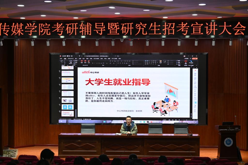 10月17日下午,传媒学院在大学生活动中心举办西北民族大学研究生招考宣讲会暨考研辅导会。会议邀请西北民族大学新闻传播学院硕士生导师王珊珊、中公教育讲师张兆杰担任主讲,学院2022级、2023级学生参加活动。会议由学院学生工作负责人主持。