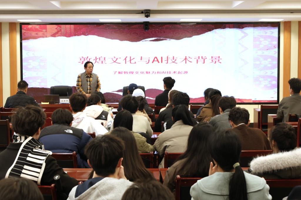讲座中,刘新民结合自身数十年创作实践,聚焦敦煌音乐主题创作,围绕“尊重传统”与“实现超越”展开,深入浅出地剖析了敦煌文化的丰富内涵与艺术价值。他分享了如何从敦煌壁画、古乐遗存中提取文化符号,将其融入现代音乐创作的思路与方法。同时,他聚焦AI技术在音乐领域的前沿应用,详细讲解了从旋律构思、编曲制作到艺术表达创新的全流程赋能路径,展现了传统艺术与现代科技碰撞出的创新火花。整场讲座兼具理论深度与实践指导性,让在场师生对“文化滋养”与“科技赋能”的融合有了更直观、深刻的认知。师生们纷纷表示,将以此次讲座为契机,从敦煌文化与丝路精神中汲取灵感,积极探索传统与创新的融合路径,让中华优秀传统文化在新时代绽放新的光彩。