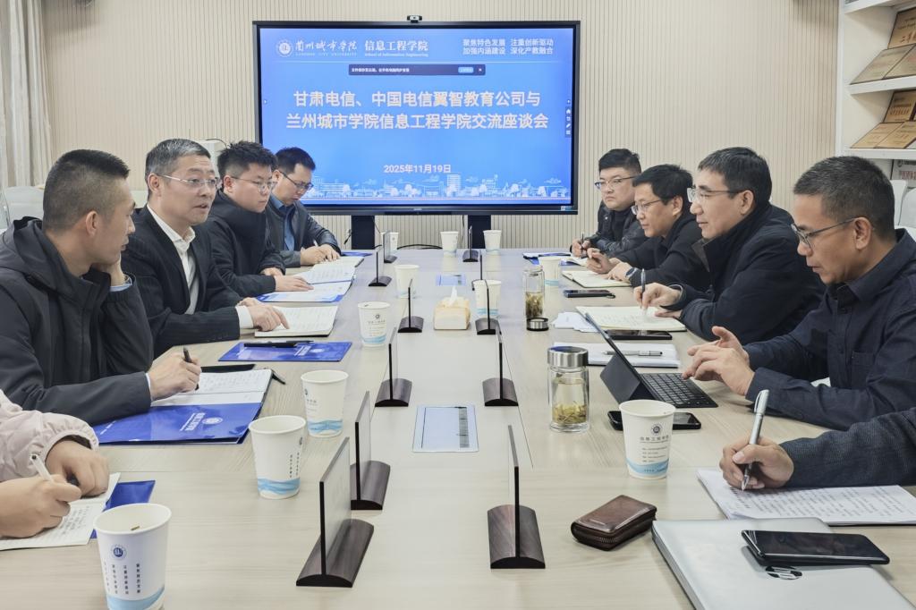 11月19日下午,中国电信甘肃分公司科教行业事业部总监杨继隆、翼智教育公司数字教育解决方案部总经理赵君成等一行7人来校,与信息工程学院相关负责人进行座谈交流。
