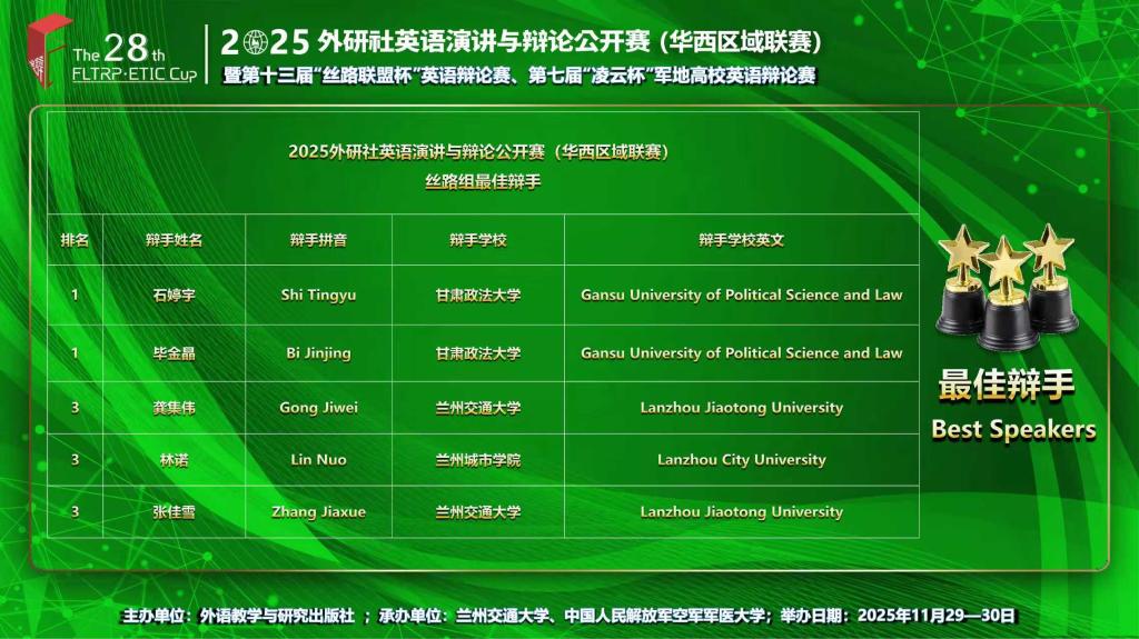 其中,外国语学院翻译242班林诺、英语232班毛汐蕊获得公开赛一等奖,林诺获最佳辩手称号;英语231班丁超颖、翻译242班王钰涵获丝路高校组一等奖(季军);翻译241班王小雨、会计222班张静获丝路高校组二等奖;翻译231班吴思思、翻译242班胡熠芙获丝路高校组三等奖。