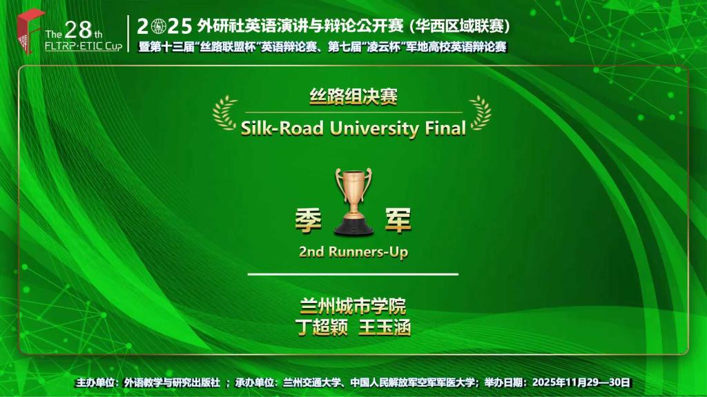 11月29日至30日,由外语教学与研究出版社主办的2025外研社英语演讲与辩论公开赛(华西)暨第十三届“丝路联盟杯”英语辩论公开赛在线上举行。伟德学子在比赛中表现优异,荣获佳绩。