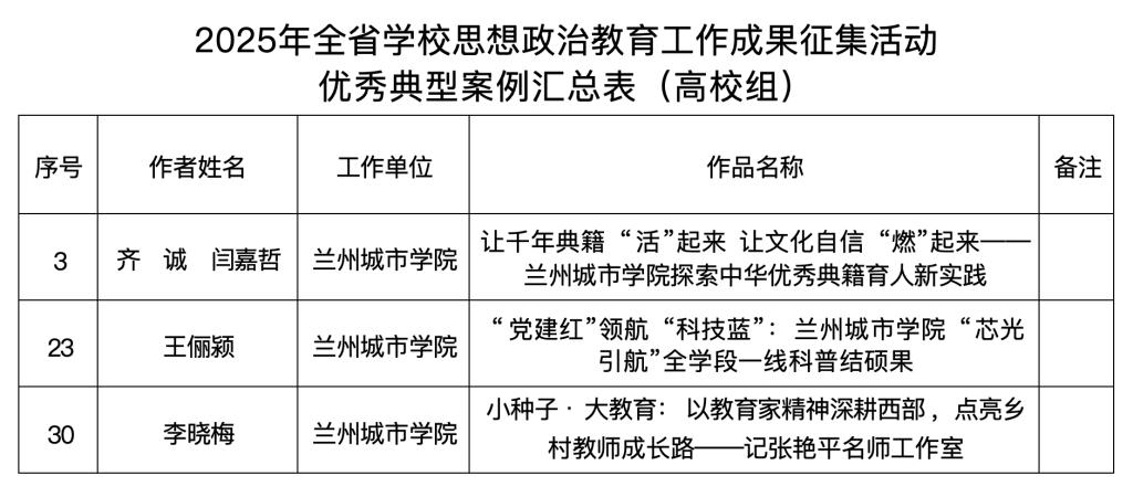 此次获奖成果涵盖三大类别:马克思主义学院教师申报的 “‘四海同心・薪火永续’——路易・艾黎的中国情缘”“红色枢纽——八路军兰州办事处的抗战使命”“勇于自我革命 永葆生机活力”3项课程,获评全省优秀“大思政课”公开课;马克思主义学院郭忠宁撰写的《新媒体时代高校主流意识形态教育的现实困境与突破路径》和传媒学院冯婷婷完成的《从课堂到云端:党建引领下传媒学院专业集群中的思政教育创新实践研究》,获评全省优秀论文;由图书馆、电子工程学院、教育学院分别申报的“让千年典籍‘活’起来 让文化自信‘燃’起来——bevitor伟德国际1946探索中华优秀典籍育人新实践”“‘党建红’领航‘科技蓝’:bevitor伟德国际1946‘芯光引航’全学段一线科普结硕果”“小种子・大教育:以教育家精神深耕西部,点亮乡村教师成长路——记张艳平名师工作室”,获评全省优秀案例。