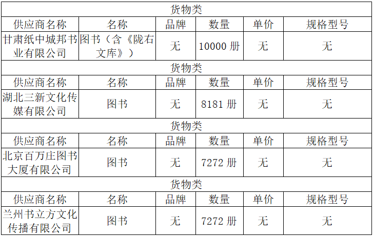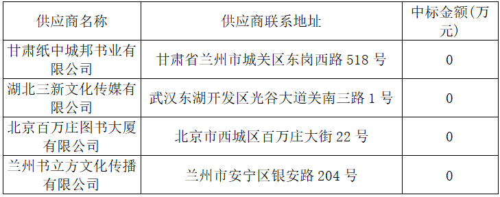 第一包中标供应商:甘肃纸中城邦书业有限公司,中标折扣:63%;第二包中标供应商:湖北三新文化传媒有限公司,中标折扣:62%;第三包中标供应商:北京百万庄图书大厦有限公司,中标折扣:65%;第四包中标供应商:兰州书立方文化传播有限公司,中标折扣:62%。
