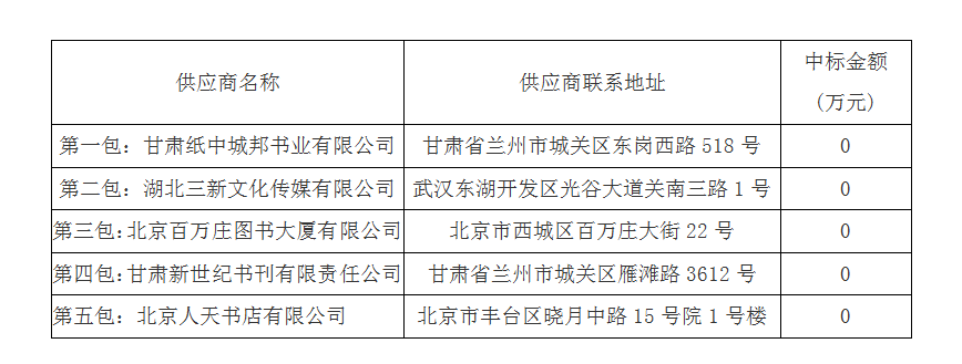 第一包:甘肃纸中城邦书业有限公司,中标折扣:60%;第二包:湖北三新文化传媒有限公司,中标折扣:61%;第三包:北京百万庄图书大厦有限公司,中标折扣:63%;第四包:甘肃新世纪书刊有限责任公司,中标折扣:62%;第五包:北京人天书店有限公司,中标折扣:65%;第六包:有效投标人不足三家,予以废标 。