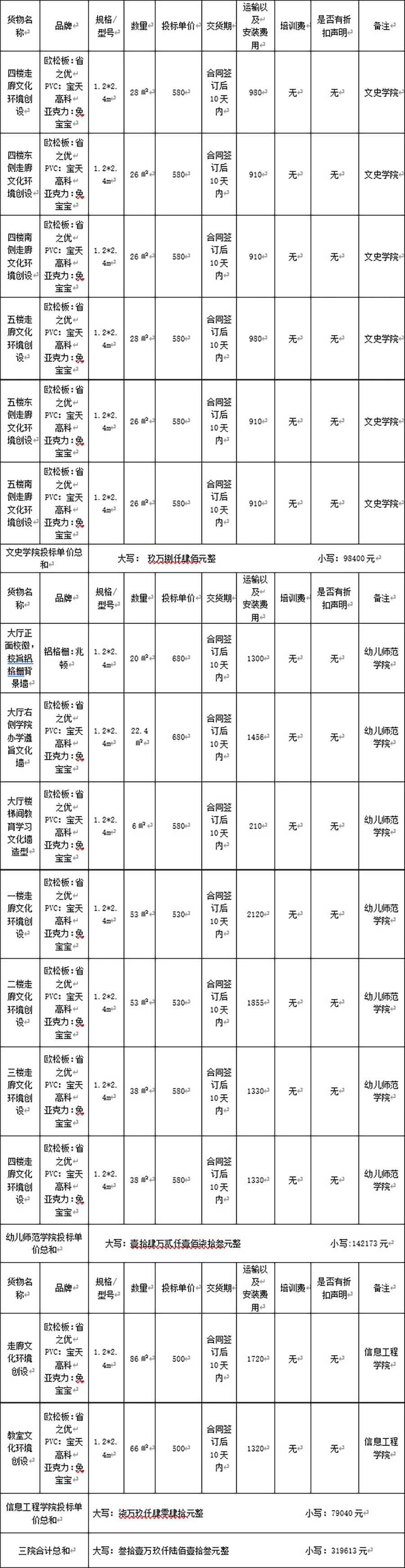 甘肃西招国际招标有限公司受bevitor伟德国际1946的委托,对“bevitor伟德国际1946二级学院文化墙建设项目(幼儿师范学院、文史学院、信息工程学院)”以邀请询价方式进行采购,询价小组于2023年10月07日评定结果。现将结果公布如下: