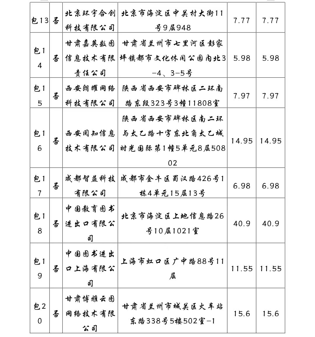 收费标准:依据采购文件规定收取,其中第1包 6060 元; 第2包 4194 元; 第3包 1125 元; 第4包 1496 元; 第5包 1000 元; 第6包 1467 元; 第7包 1122 元; 第8包 1000 元; 第9包 1047 元; 第10包 1000 元; 第11包 1000 元; 第12包 1000 元; 第13包 1166 元; 第14包 1000 元; 第15包 1196 元; 第16包 2243 元; 第17包 1047 元; 第18包 6135 元; 第19包 1733 元; 第20包 2340 元。