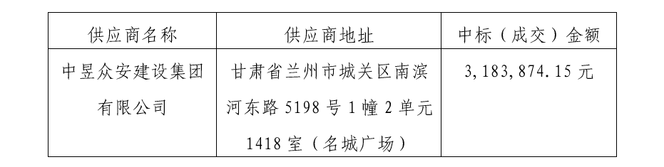 代理服务费收费标准:供应商应支付给甘肃安宇工程造价咨询有限公司招标服务费(收费标准参照国家计委计价格【2002】1980号文和发改办价格【2003】857号文中招标类型差额定率累进法计算)和其他与之相关的费用。