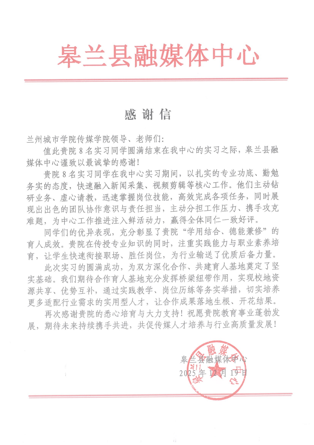 近日,传媒学院收到皋兰县融媒体中心发来的感谢信,对学院8名实习学生的专业能力和实践表现给予充分肯定,并对学院在校地合作与人才培养方面给予的支持表示感谢。