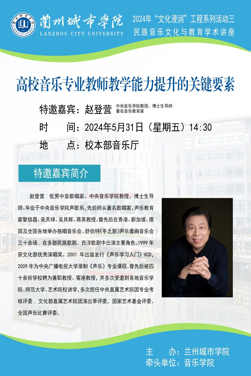 应科学技术处、甘肃省民族音乐研究中心和音乐学院联合邀请,中央音乐学院教授赵登营将来伟德作学术报告。具体事宜公告如下: