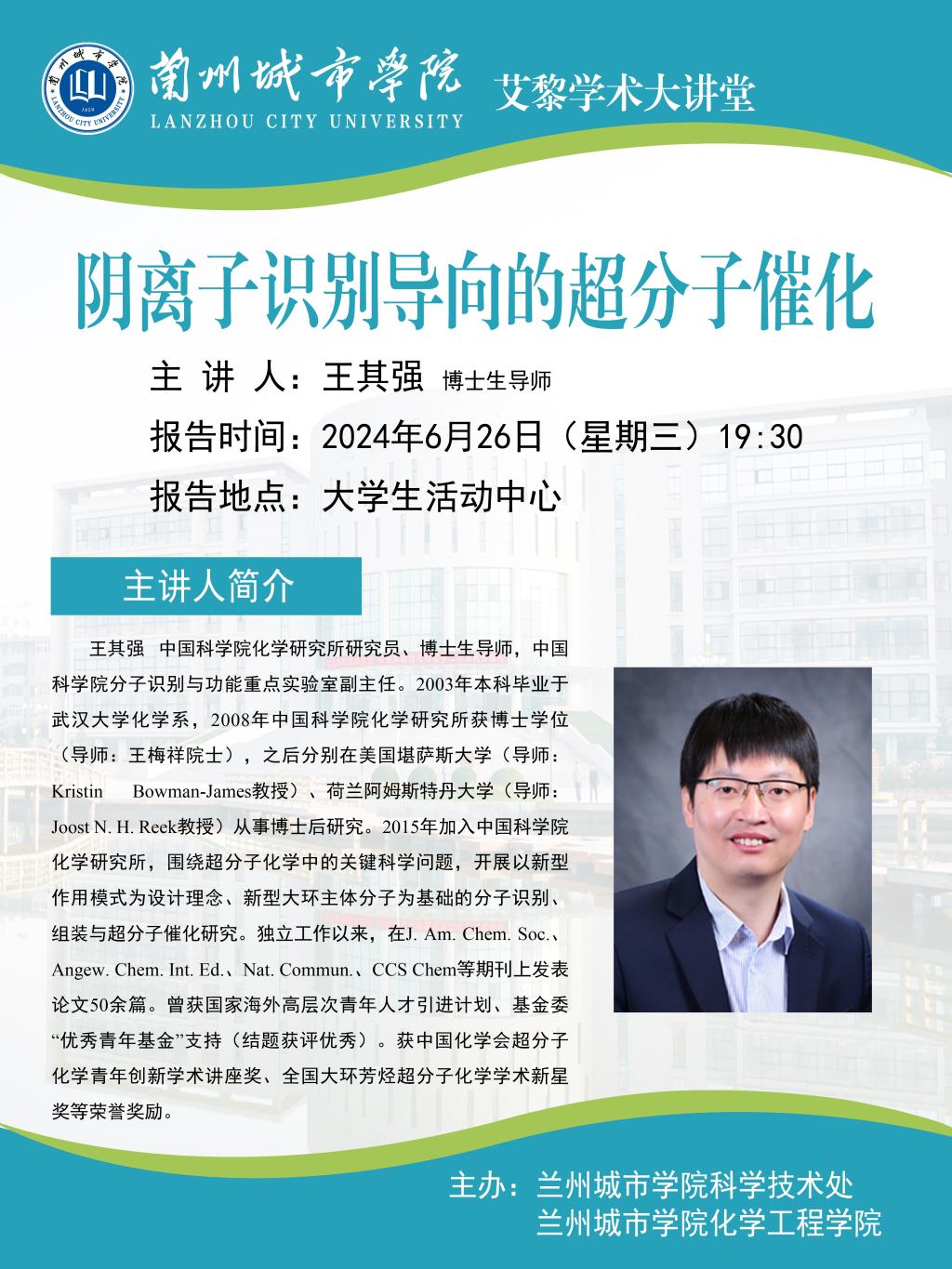 应科学技术处和化学工程学院联合邀请,中国科学院化学研究所王其强研究员将来伟德作学术报告。具体事宜公告如下: