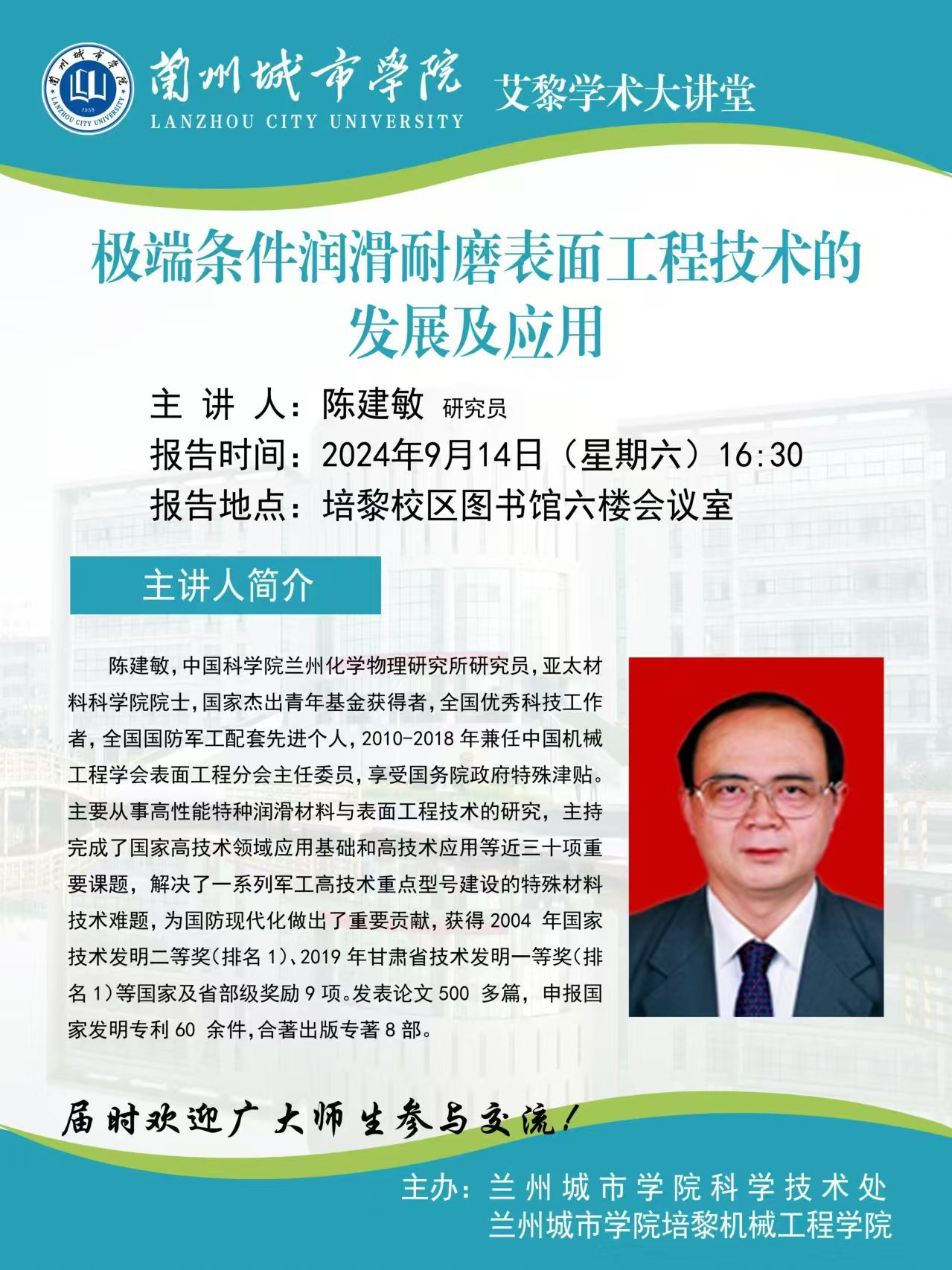 应科学技术处和培黎机械工程学院联合邀请,中国科学院兰州化学物理研究所陈建敏研究员将来伟德作学术报告。具体事宜公告如下: