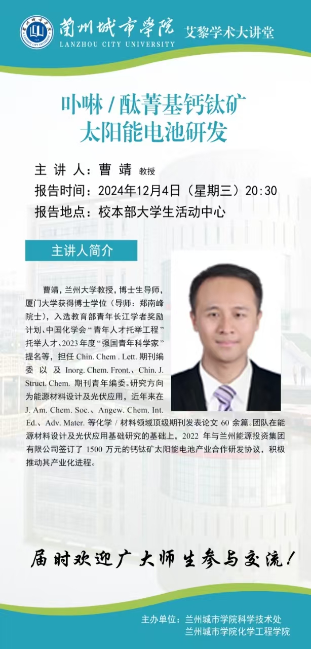 应科学技术处和化学工程学院联合邀请,兰州大学曹靖教授将来伟德作学术报告。具体事宜公告如下: