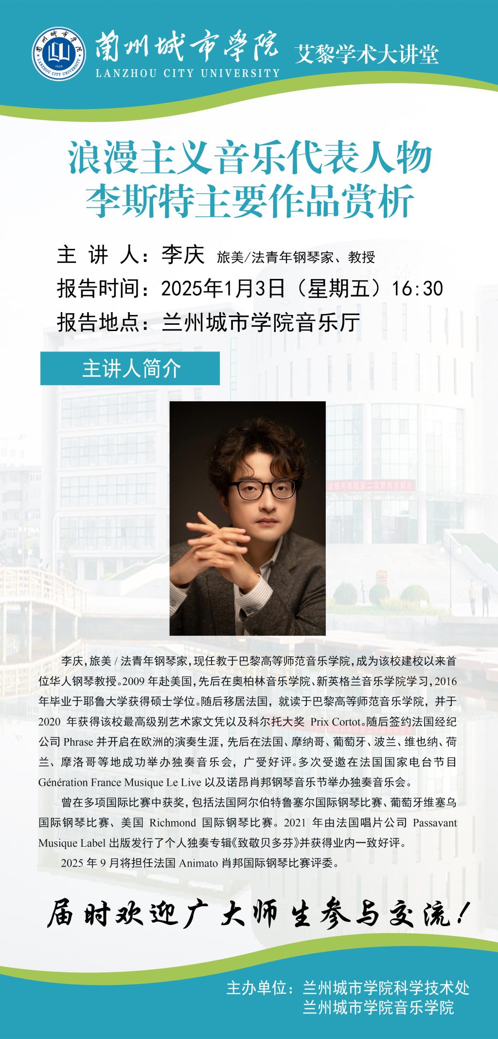 应科学技术处和音乐学院联合邀请,旅美/法青年钢琴家李庆教授将来伟德作学术报告。具体事宜公告如下: