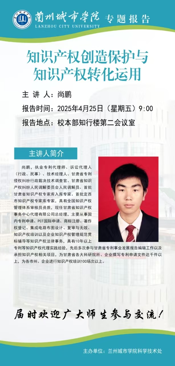 应科学技术处邀请,甘肃省知识产权事务中心代理有限公司尚鹏总经理将来伟德作专题报告。具体事宜公告如下: