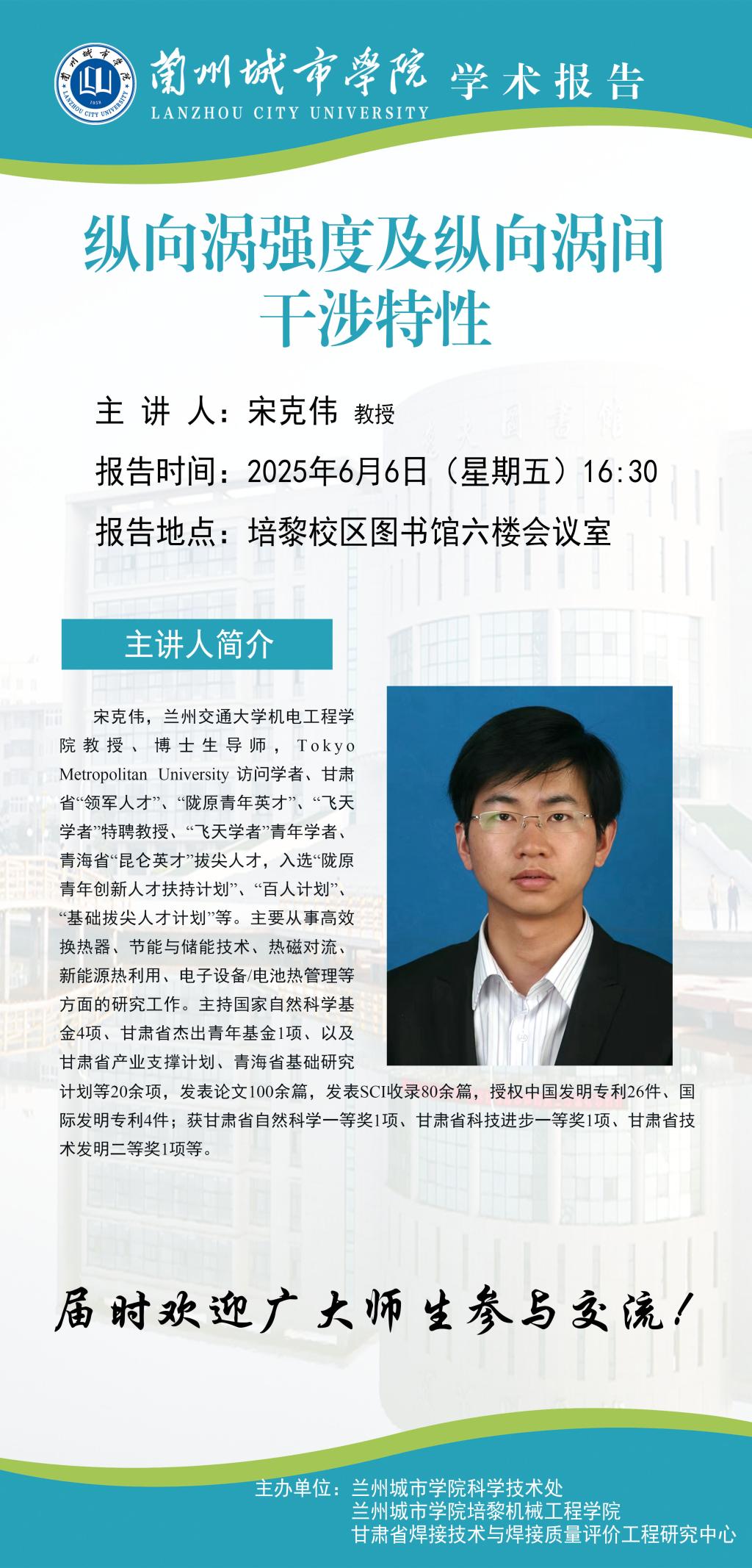 应科学技术处、培黎机械工程学院和甘肃省焊接技术与焊接质量评价工程研究中心联合邀请,兰州交通大学宋克伟教授将来伟德作学术报告。具体事宜公告如下: