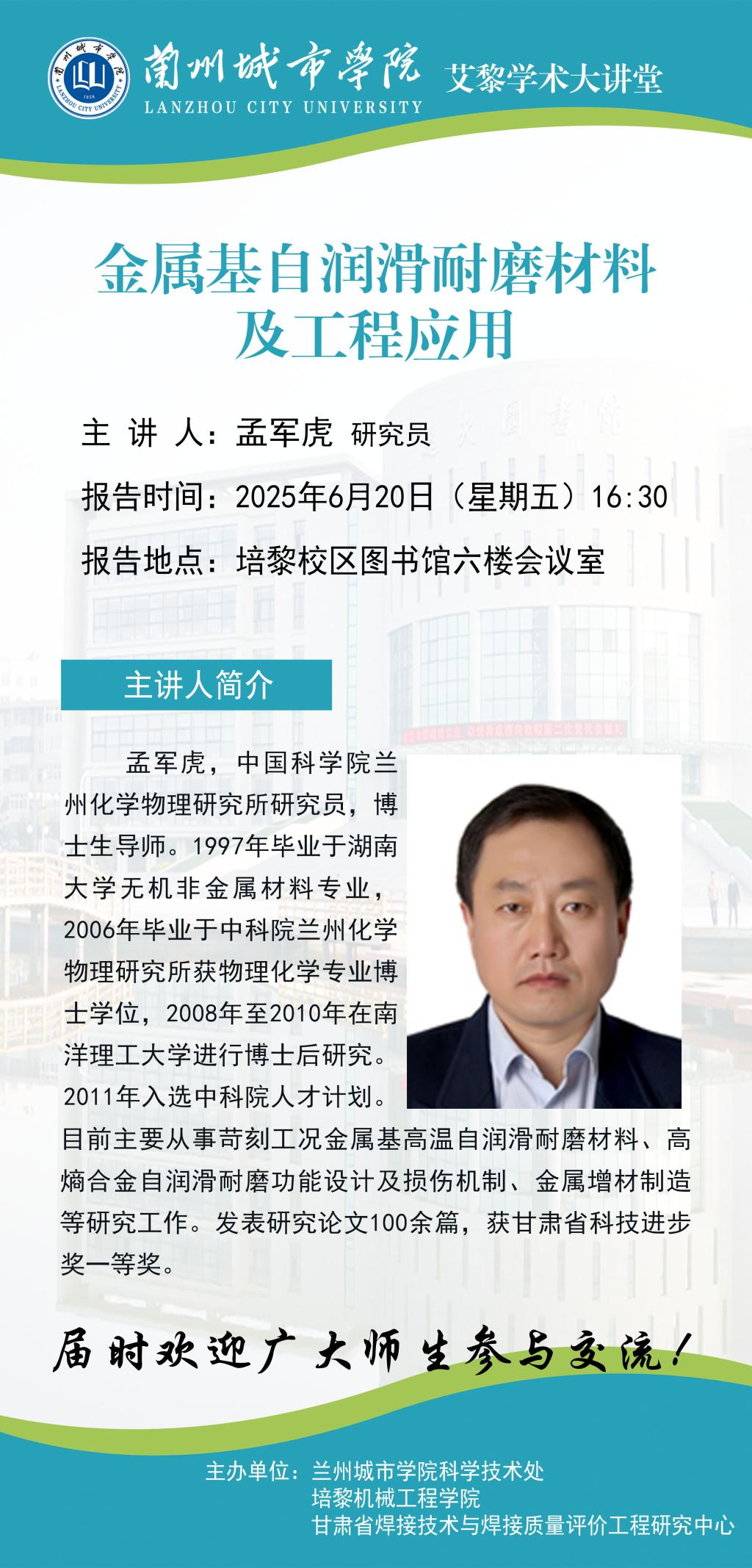 应科学技术处、培黎机械工程学院和甘肃省焊接技术与焊接质量评价工程研究中心联合邀请,中国科学院兰州化学物理研究所孟军虎研究员将来伟德作学术报告。具体事宜公告如下: