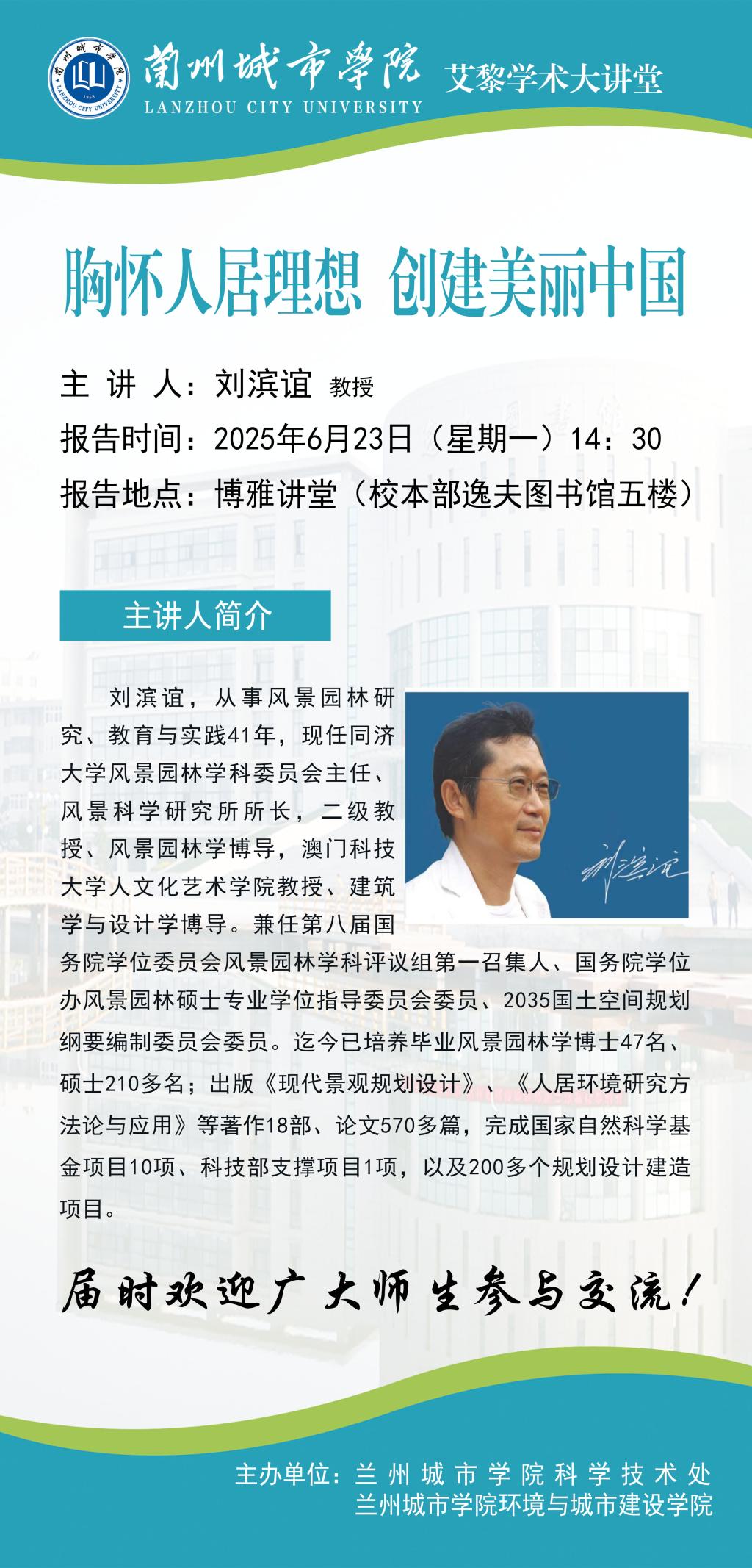 应科学技术处、环境与城市建设学院联合邀请,同济大学刘滨谊教授将来伟德作学术报告。具体事宜公告如下:
