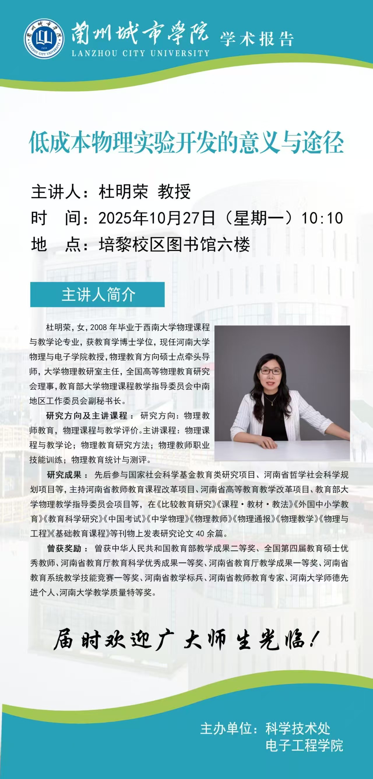 应科学技术处、电子工程学院联合邀请,河南大学杜明荣教授来伟德作学术报告。具体事宜公布如下: