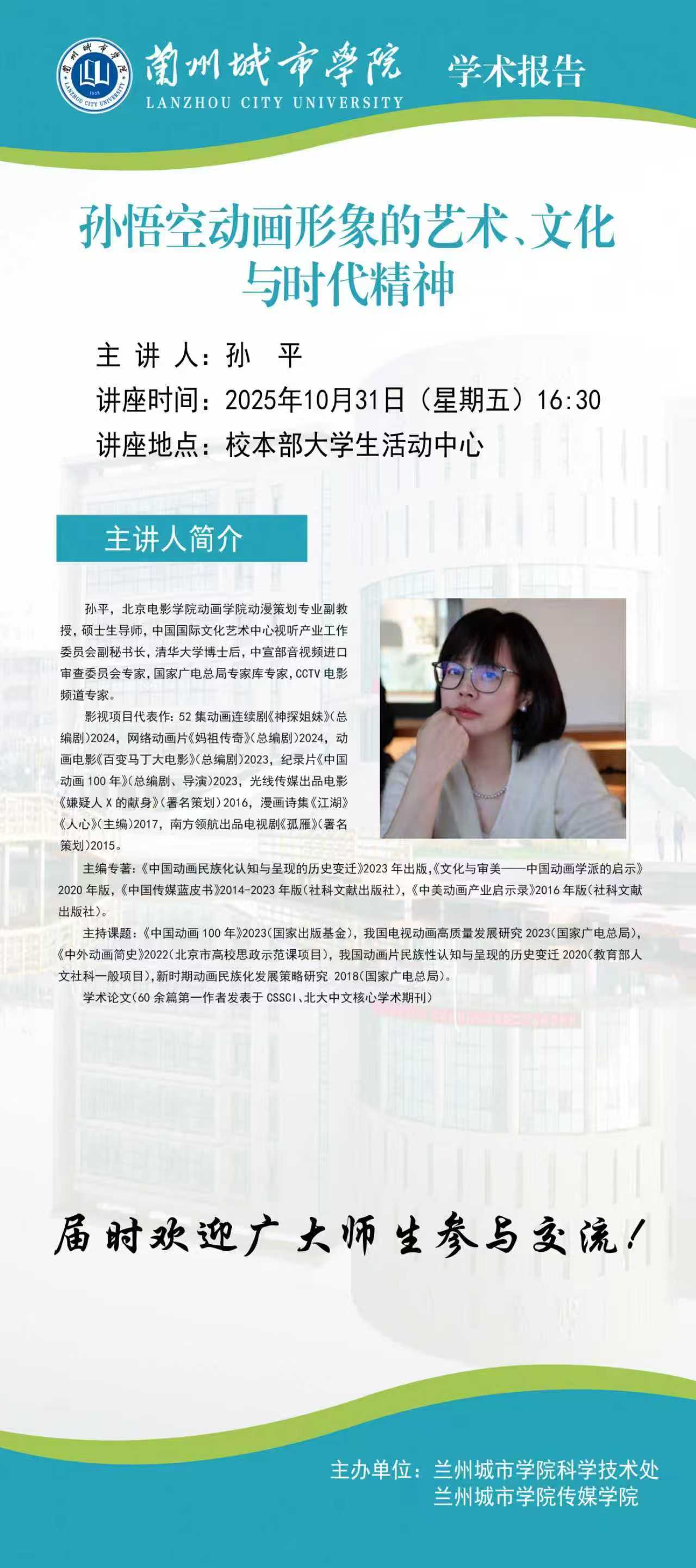 应科学技术处和传媒学院联合邀请,北京电影学院动画学院动漫策划专业副教授,硕士生导师孙平来伟德作学术报告。具体事宜公布如下: