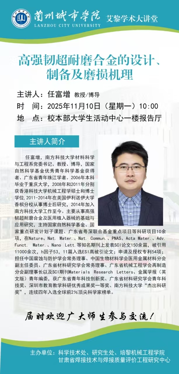 应科学技术处、研究生处、培黎机械工程学院、甘肃省焊接技术与焊接质量评价工程研究中心联合邀请,南方科技大学任富增教授将来伟德作学术报告。具体事宜公告如下: