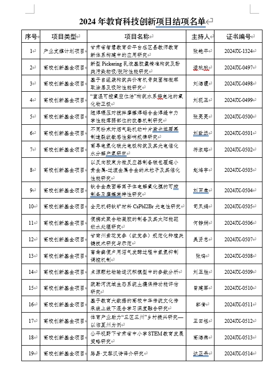 近日,2024年教育科技创新项目结项结果揭晓。根据《甘肃省教育厅关于公布2024年教育科技创新项目结项结果的通知》(甘教技函〔2024〕23号),伟德共有30项项目顺利结项,结项结果详情见下表。