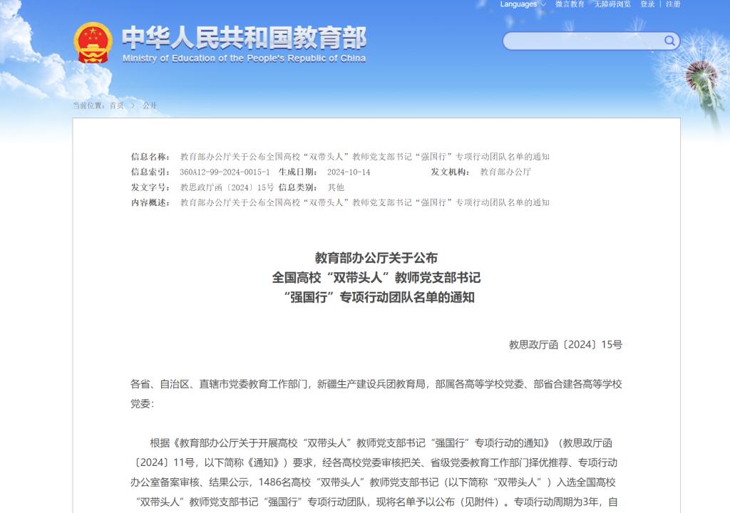 高校“双带头人”教师党支部书记“强国行”专项行动,是教育部为创新落实立德树人根本任务、贯彻落实高校“双带头人”教师党支部书记培育工程的重要举措,旨在引导广大师生在以中国式现代化全面推进强国建设、民族复兴伟业新征程上砥砺新担当、展现新作为。入选团队将在未来三年的专项行动周期内,聚焦服务国家重大战略和地方经济社会高质量发展,积极开展党建联建、教育服务、科技赋能、实践育人等各项任务,着力形成品牌效应,不断扩大社会影响。