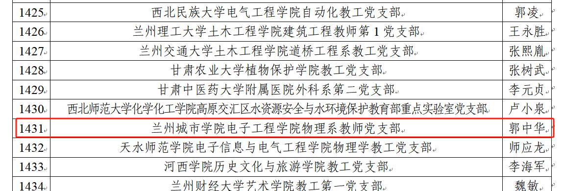 电子工程学院物理系教师党支部自2018年成立以来,注重发挥政治引领、规范组织生活、团结凝聚师生、促进中心工作等方面的主体作用,充分发挥党支部的战斗堡垒作用和党员的先锋模范作用,在教学、科研、管理和服务等方面取得了良好的成绩。党支部获批甘肃省第一批新时代大中小学“双优”党支部书记工作室和第三批新时代甘肃省高校“样板党支部”培育创建单位,党支部书记个人荣获第二批新时代甘肃省高等院校党建工作优秀教师党支部书记“双带头人”称号。