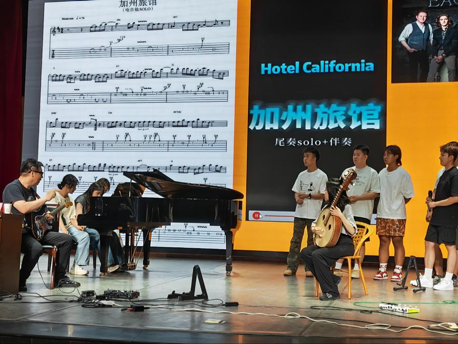 在讲座中,魏新水引导学生们深入了解节奏、和声与solo之间的关联,并带领大家进行即兴音乐的实践探索。现场,学生们积极参与,与老师热情互动交流,共同尝试了《加州旅店》等经典乐曲的即兴律动和solo练习,气氛热烈。此次讲座也是作为音乐表演艾黎学科建设成果展示之一。