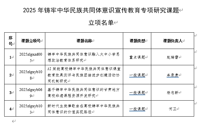 2025年6月9日,甘肃省教育厅与甘肃省民族事务委员会公布2025年铸牢中华民族共同体意识宣传教育专项研究课题立项结果,伟德共有4项课题获准立项,其中重点课题1项,一般课题3项。详情见下表: