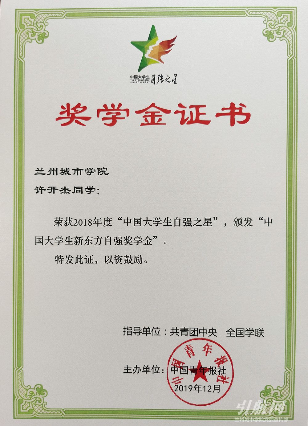 近日,由共青团中央、全国学联共同组织开展的2018年度“中国大学生自强之星”寻访活动结果揭晓,伟德电子与信息工程学院电子信息科学与技术专业151班学生许开杰荣获2018年度“中国大学生自强之星”荣誉称号,并获得“中国大学生新东方自强奖学金”。