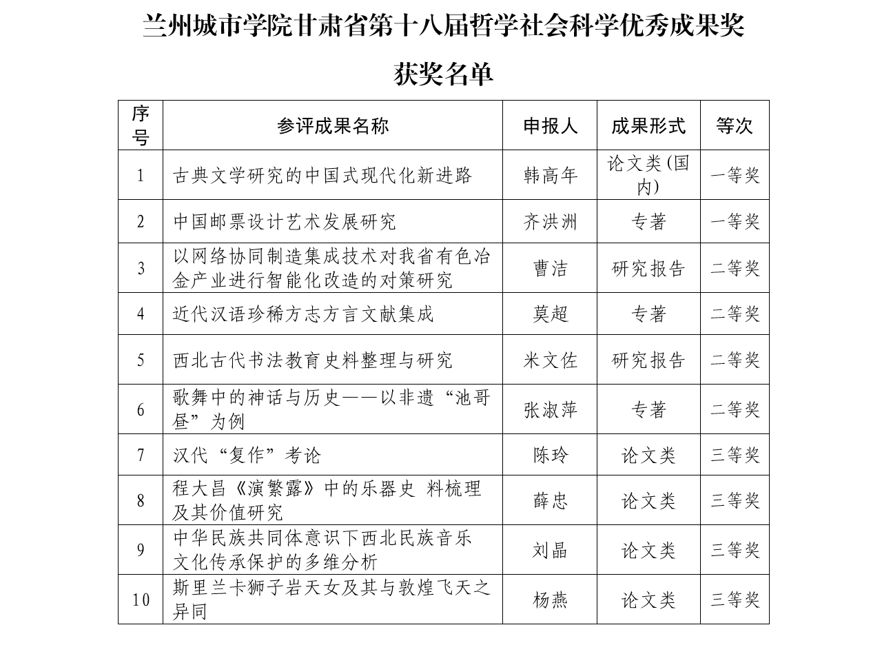 11月14日,甘肃省第十八届哲学社会科学优秀成果奖公布,伟德共有10项优秀研究成果获奖,其中一等奖2项、二等奖4项、三等奖4项,获奖等次再创新高,充分展现了学校在哲学社会科学研究领域的实力与创新活力。