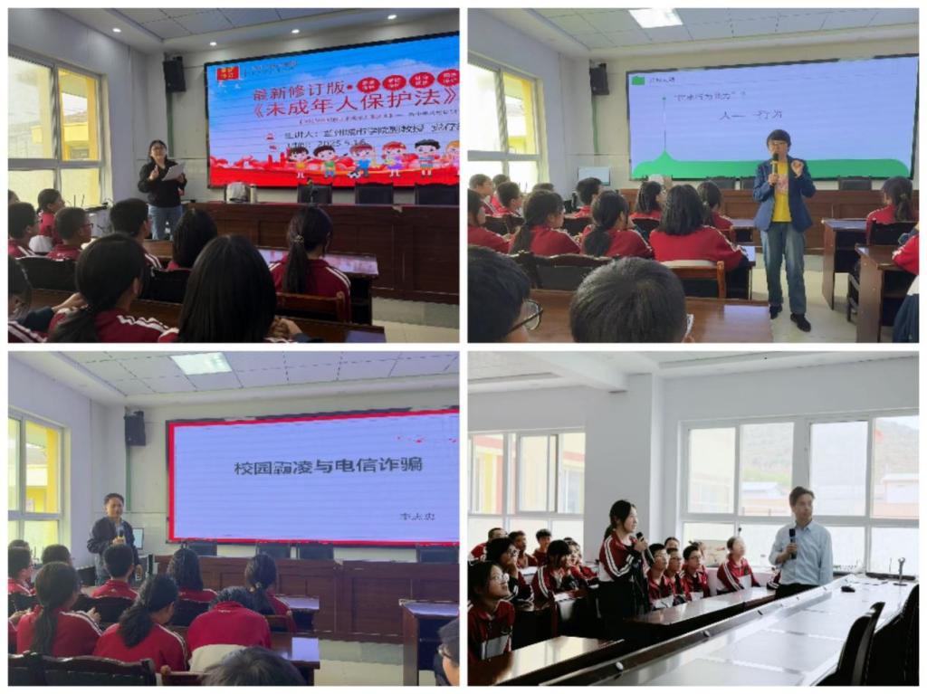 活动中,法律咨询与服务中心的四位党员教师分别为寺咀学校初一、初二年级的126名同学作了法治进校园宣讲。学院教师以近期社会热点案件为例,围绕《民法典中的民事行为能力》这一主题,以讲故事的形式将民事行为能力、民事行为有效性年龄界定、完全民事行为能力人条件等法律知识植入在场同学们的心田,并结合新修订的《未成年人保护法》,系统解读了未成年人享有的家庭、学校及社会保护权益,引导同学们学会通过合法途径维护自身权益。针对校园霸凌和电信诈骗等常见问题,老师们详细剖析了肢体欺凌、网络欺诈等行为的防范要点,并从提出了一系列应对预防措施。在场同学纷纷表示,宣讲案例丰富、讲解生动,学到了很多维护自身合法权益、防范身边各种风险的法律知识。
