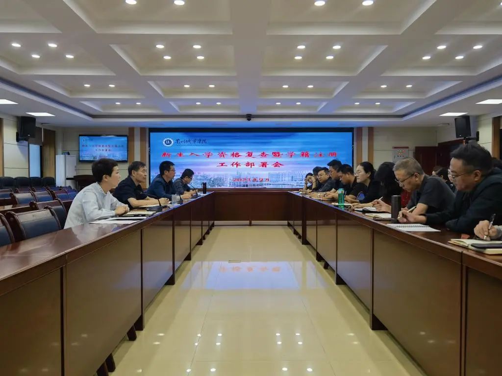 【9月14日】新生入学资格复查暨学籍注册工作部署会在校本部第二会议室召开。党委常委、副校长牟录贵出席会议并讲话,学校纪委、监察专员办公室,招生就业处、教务处、二级学院负责人,学籍管理工作人员参加会议。