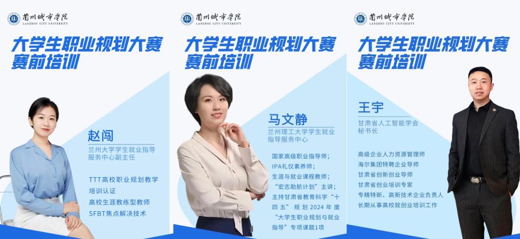 【9月11日至13日】学校邀请兰州理工大学学生就业指导服务中心马文静、甘肃省人工智能学会秘书长王宇、兰州大学学生就业指导服务中心副主任赵闯为三校区学生做大学生大学生职业规划大赛赛前培训。