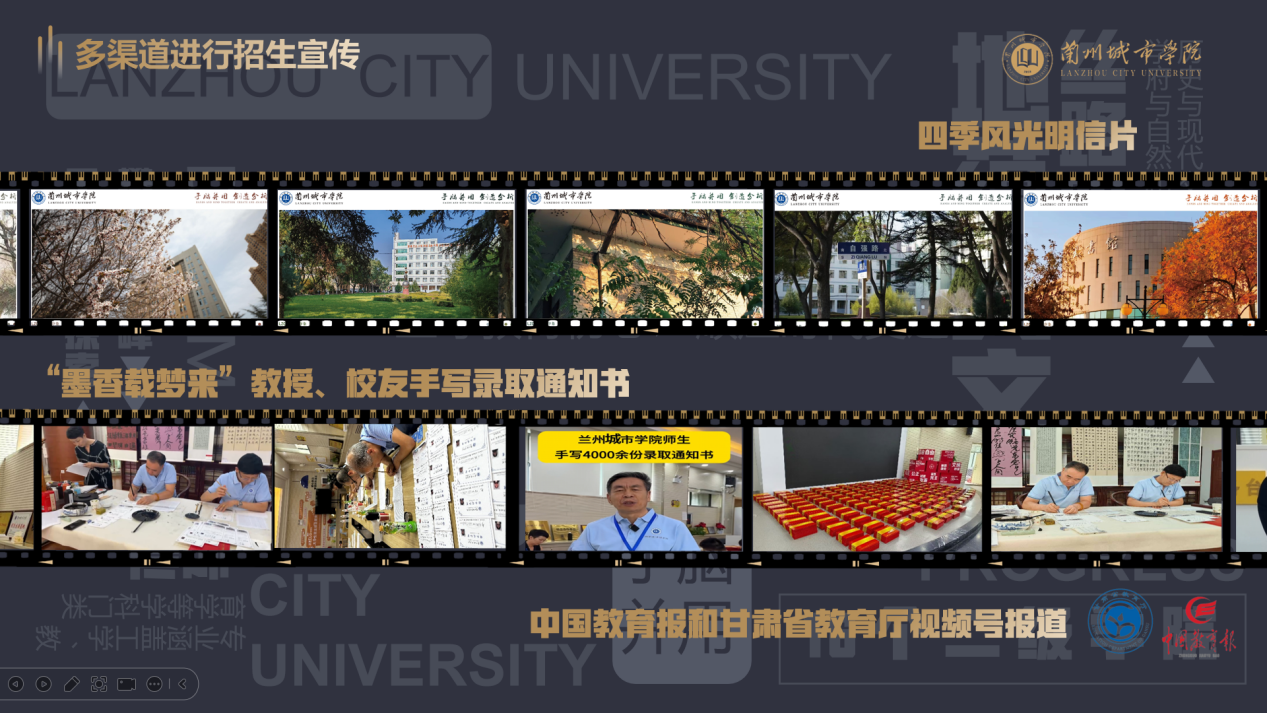 在录取通知书中放入学校四级风光明信片,让新生提前与学校“谋面”;开启“墨香载梦来”手写录取通知书,深受考生好评,同时也受到中国教育报和甘肃省教育厅官方视频号以及各类省内主要媒体的报道;