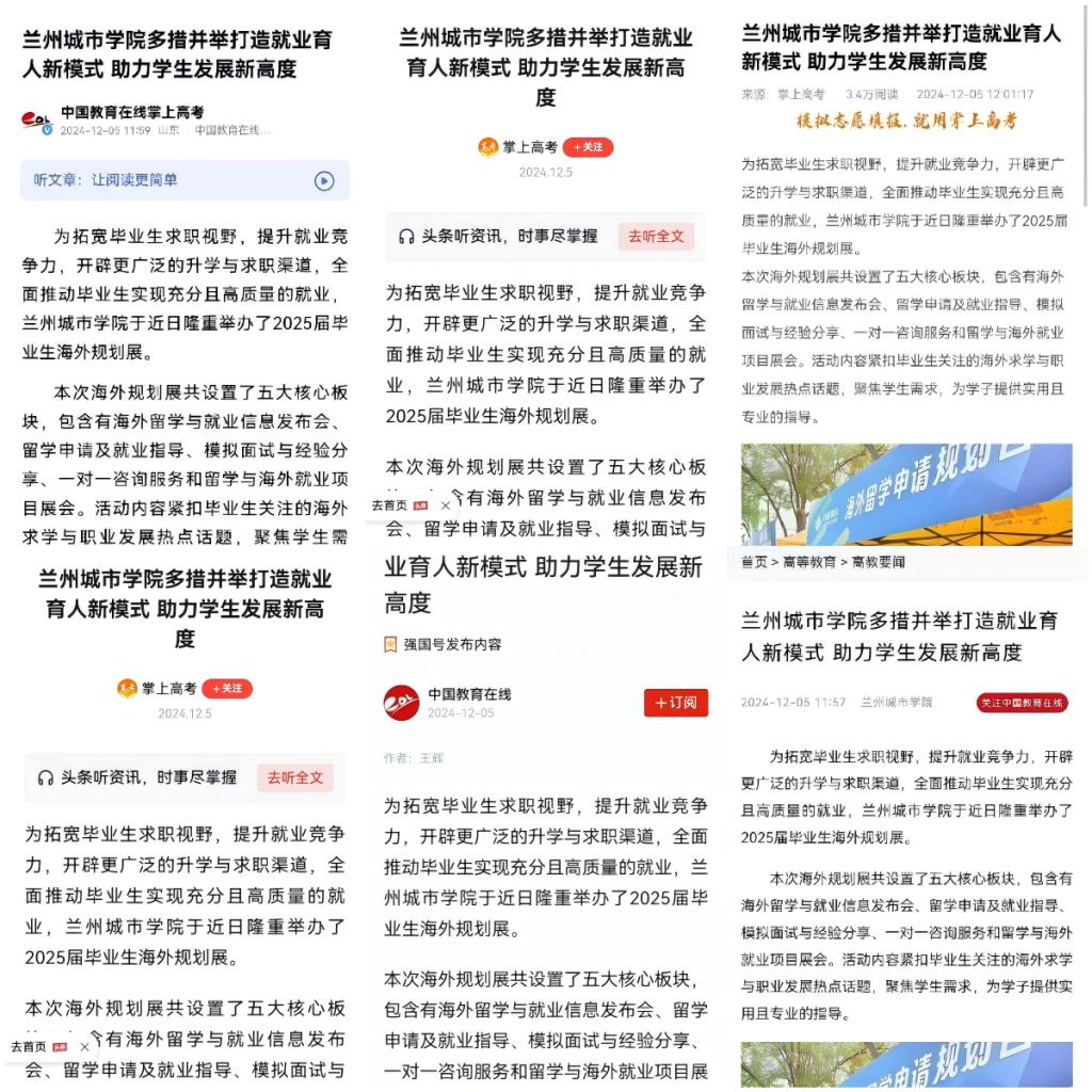 【12月5日】学习强国、中国新闻网、甘肃日报、今日头条、掌上高考、百家号等多家媒体发布《bevitor伟德国际1946多措并举打造就业育人新模式 助力学生发展新高度》,对伟德举办2025届毕业生海外规划展进行报道。