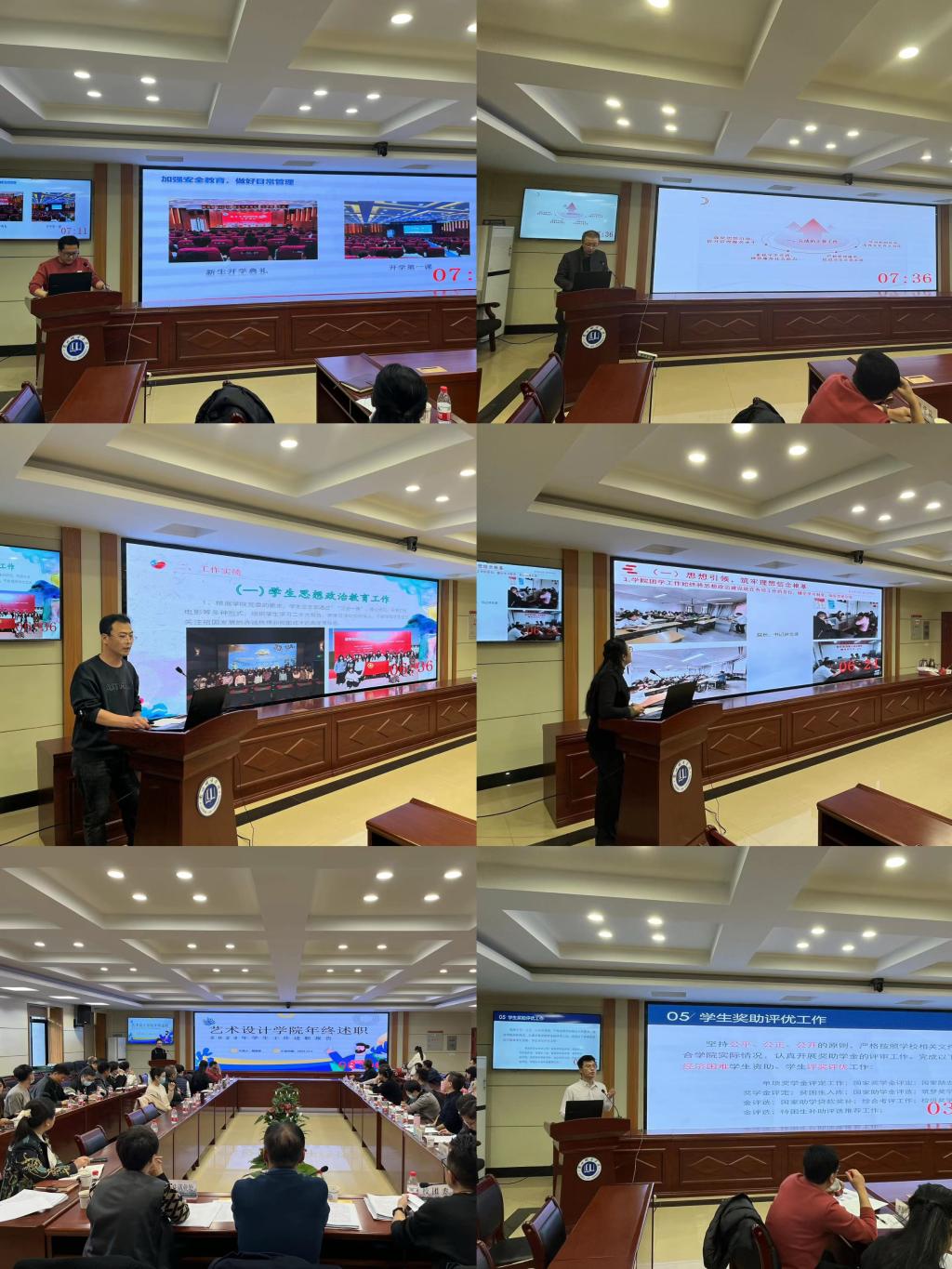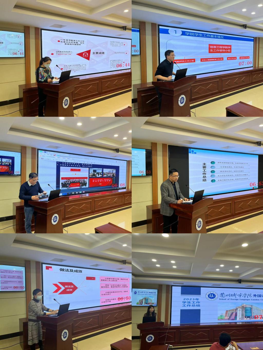 各二级学院梳理和总结一年来的学生工作开展情况,形成学生工作述职报告,由各学院分管学生工作的负责人以PPT形式进行现场述职。汇报围绕学生工作组织领导和队伍建设、学生教育管理服务工作、维护校园稳定工作、学生帮扶与心理健康教育工作、学生奖助评优工作、学生公寓工作、学生评价、思想引领工作、党建带团建工作、第二课堂工作等工作开展的基本情况、主要做法、特色亮点、存在的问题及意见建议进行了详细阐述,多角度、全方位地展示了各学院2023年的学生工作成果;并在全面客观总结成绩的基础上,深入查找工作短板和存在问题,提出改进措施,明确下一步工作思路。