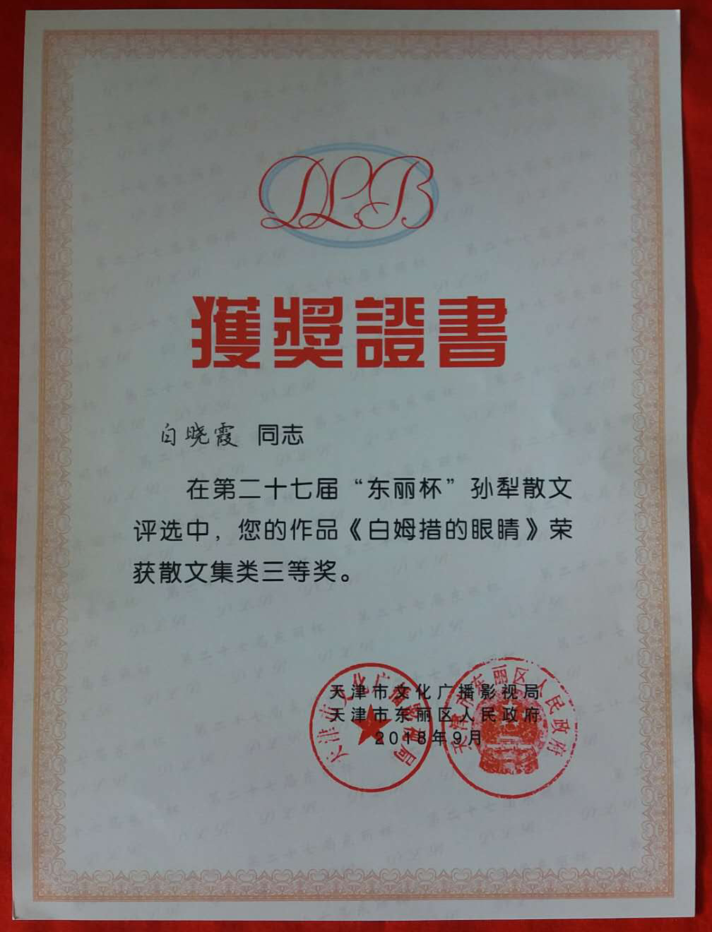 日前,第二十七届“东丽杯”孙犁散文评选颁奖活动和第十一届全国群众文学散文创作论坛在天津举行。伟德白晓霞老师的散文集《白姆措的眼睛》荣获该评选活动散文集奖三等奖。