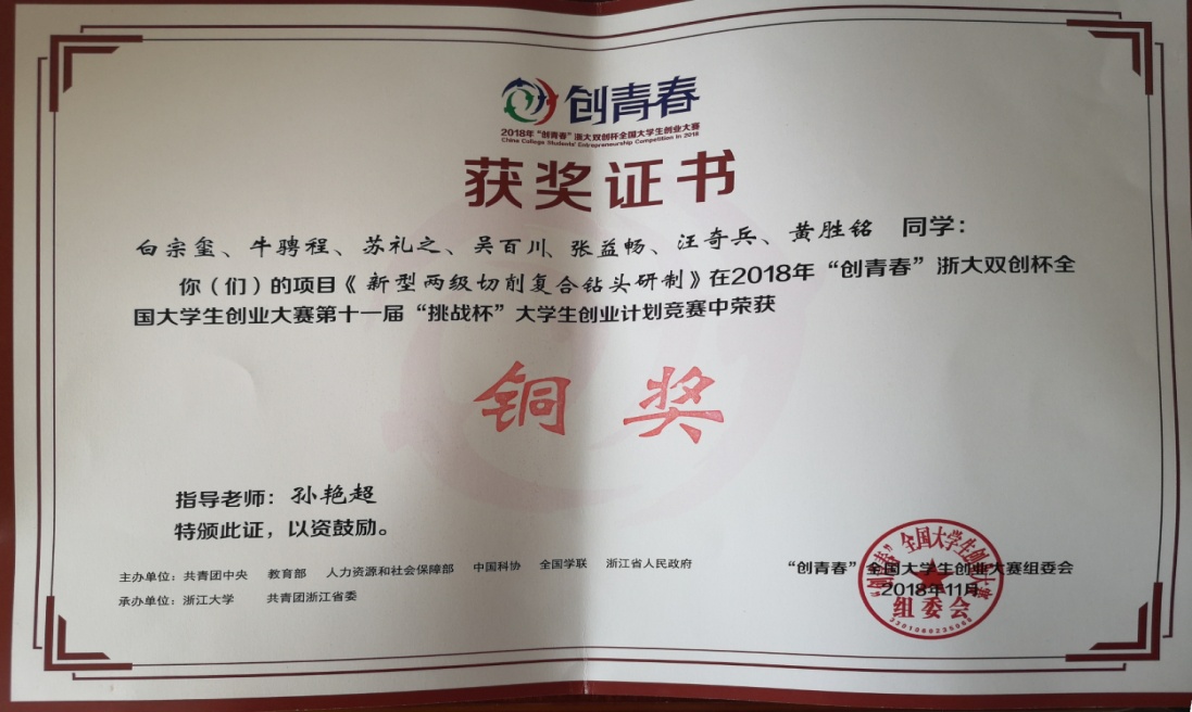 由培黎石油工程学院孙艳超老师指导,白宗玺、牛骋程、苏礼之、吴百川、张益畅、汪奇兵、黄胜铭等学生共同完成的作品《新型两级切削复合钻头研制》项目荣获2018年“创青春”浙大双创杯全国大学生创业大赛第十一届“挑战杯”大学生创业计划竞赛铜奖。展现了学校学子风采,为学校赢得了荣誉。