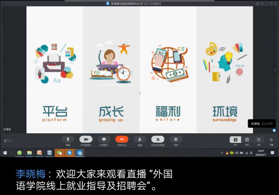 为进一步帮助毕业生掌握就业政策、提高就业面试技巧和搭建就业平台,4月7日下午,外国语学院利用钉钉线上平台举办了春季就业指导暨宣讲招聘会。广铁一中外国语小学、西安高途课堂、临夏海伦教育、多维教育集团、星火教育、兰州市城关区爱德培训学校有限公司、兰州市第八十二中学、中国甘肃国际经济技术合作总公司和松鼠AI智适应教育等九家用人单位参会。学院就业工作负责人与2020届毕业班80余名学生一起参加会议。